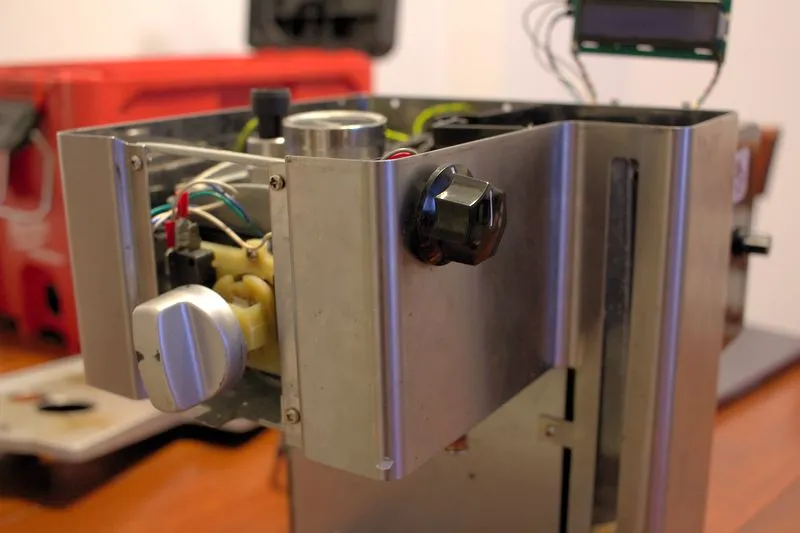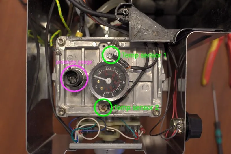 Obviously, there are two pressure sensors/gauge right next to the temperature sensors. These bad guys have had holes drilled and tapped into the thermoblock. The analog gauge is often used to mod the Gaggia Classics. Can be had for around 30USD I believe. The pressure sensor is from Amazon. It's a 300PSI sensor with 1/8NPT threads (nightmare) which outputs supposedly 0.5-4.5V depending on the pressure. However, as I found out, this 25CAD sensor likes to free-run above around 80C and outputs a bunch of gibberish voltage. Since in the programming of my Arduino the pump stopped when the sensor saw 9bar+, when the sensor got into crazy mod and stuck at 18bar+, I couldn't get the pump to run at all. This sensor has been bypassed and replaced by a simple potentiometer seen on the front side of the machine, with a big knob (big knobs are koooool).