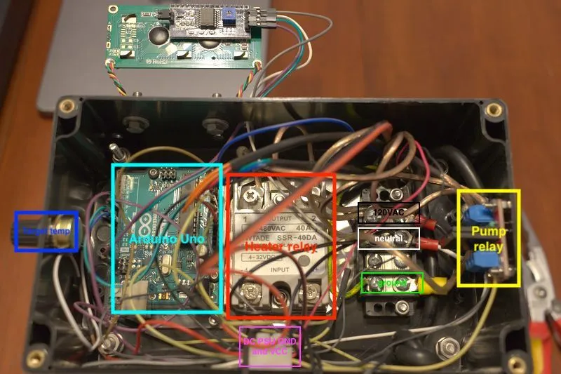 Simply a higher VAC rating terminal block for splitting the VAC stuff. There's AC120V coming in from the wall that need to go to both the pump relay and heater relay. Both have a neutral coming back. This could have been done with soldering and shrink but I wanted the flexibility and serviceability of a terminal block. And I had one lying around sooo...
