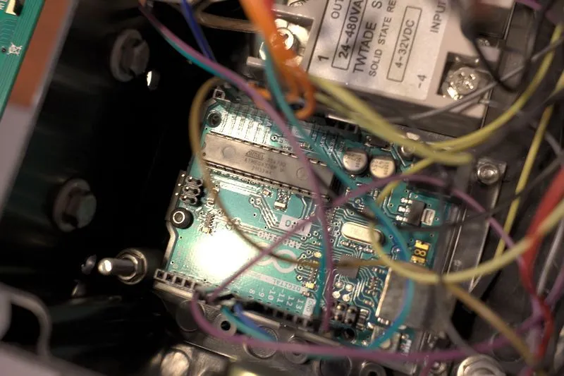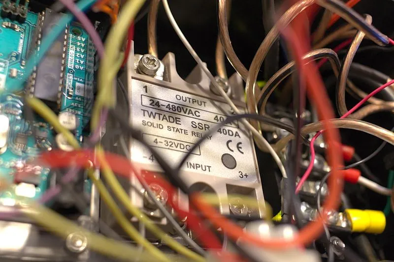 This is a pretty neat solid state relay. It's about 30CAD? on Amazon. Rated at 480VAC and 40A, it is more than enough for the heater. I was actually going for the 20A relay when I saw that this 40A was 1-2$ cheaper soooooo.... Works like a champ. The back of the relay is bolted with thermal paste to the stainless steel case of the CafeRoma, there's a hole cut into the plastic box to accommodate this. These relays usually need a heatsink to stay happy but sinking it's thermal output into the stainless steel enclosure seems more than enough.